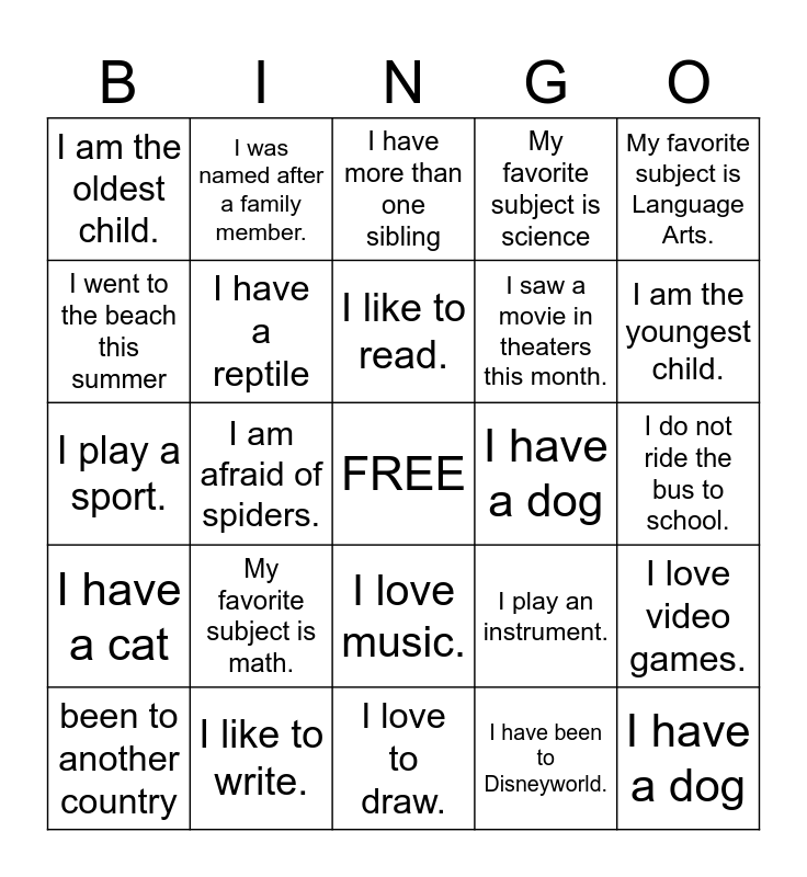 This bingo card has a free space and 24 words: My favorite subject is math., I like to write., I like to read., been to another country, My favorite subject is Language Arts., I am the oldest child., I went to the beach this summer, I was named after a family member., I have a dog, I love music., I saw a movie in theaters this month., I play a sport., I play an instrument., I love video games., I have a reptile, I have been to Disneyworld., I do not ride the bus to school., I have more than one sibling, I am the youngest child., I am afraid of spiders., I have a dog, I have a cat, My favorite subject is science and I love to draw..