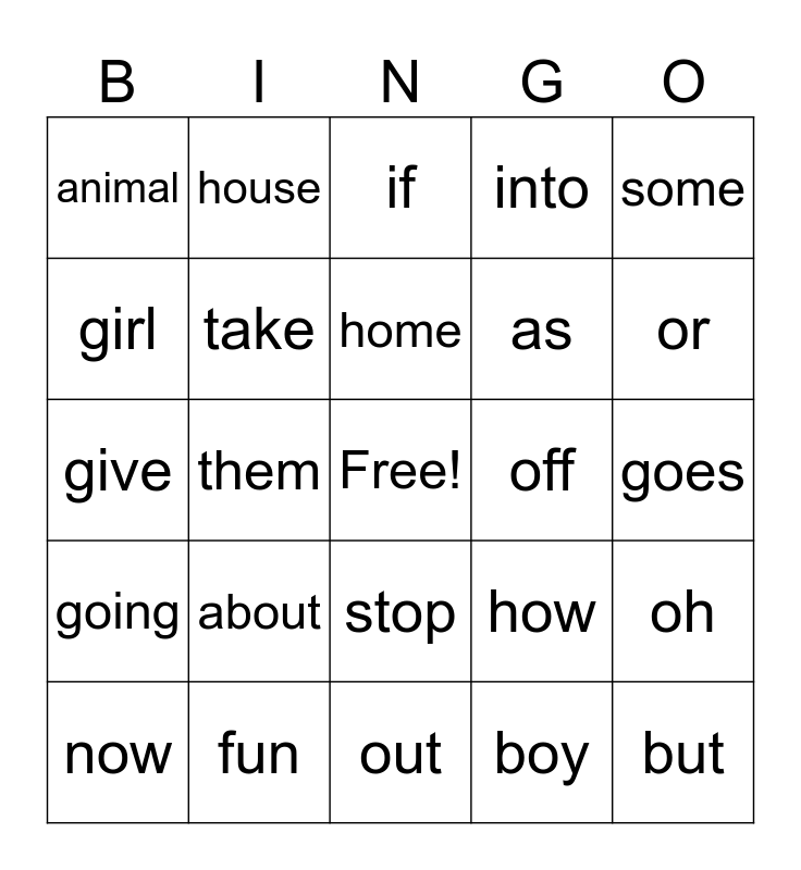 This bingo card has a free space and 24 words: about, fun, home, now, some, animal, girl, house, off, stop, as, give, how, oh, take, boy, goes, if, or, them, but, going, into and out.