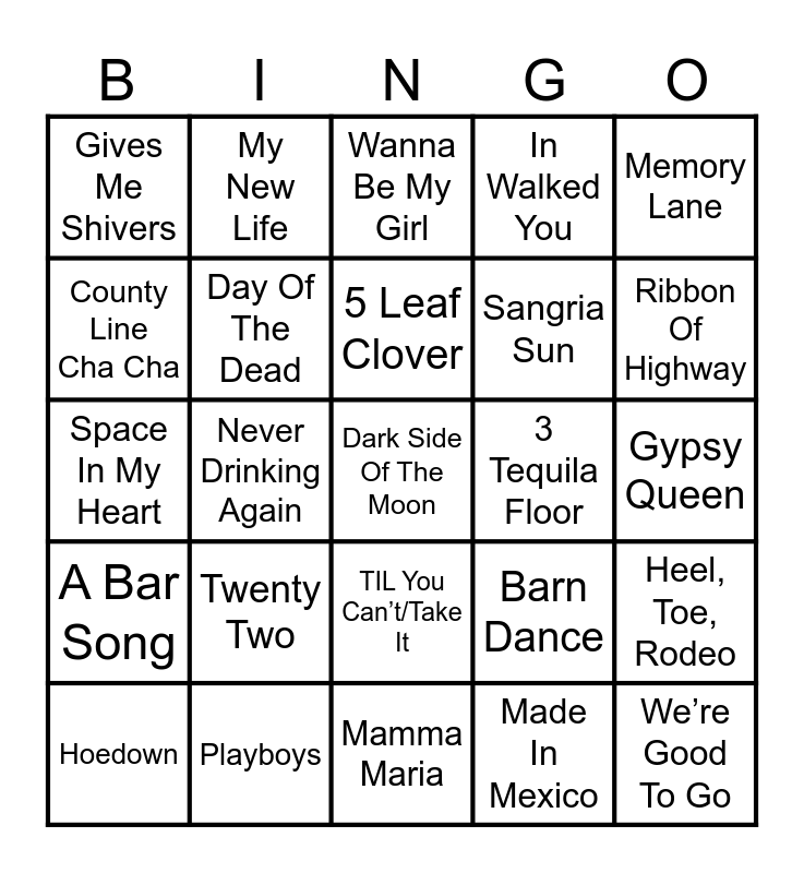 This bingo card has a free space and 24 words: Twenty Two, Playboys, 5 Leaf Clover, Hoedown, Memory Lane, Gives Me Shivers, County Line Cha Cha, My New Life, 3 Tequila Floor, TIL You Can’t/Take It, Sangria Sun, Space In My Heart, Barn Dance, Heel, Toe, Rodeo, Day Of The Dead, Made In Mexico, Gypsy Queen, Wanna Be My Girl, Ribbon Of Highway, Never Drinking Again, We’re Good To Go, A Bar Song, In Walked You and Mamma Maria.