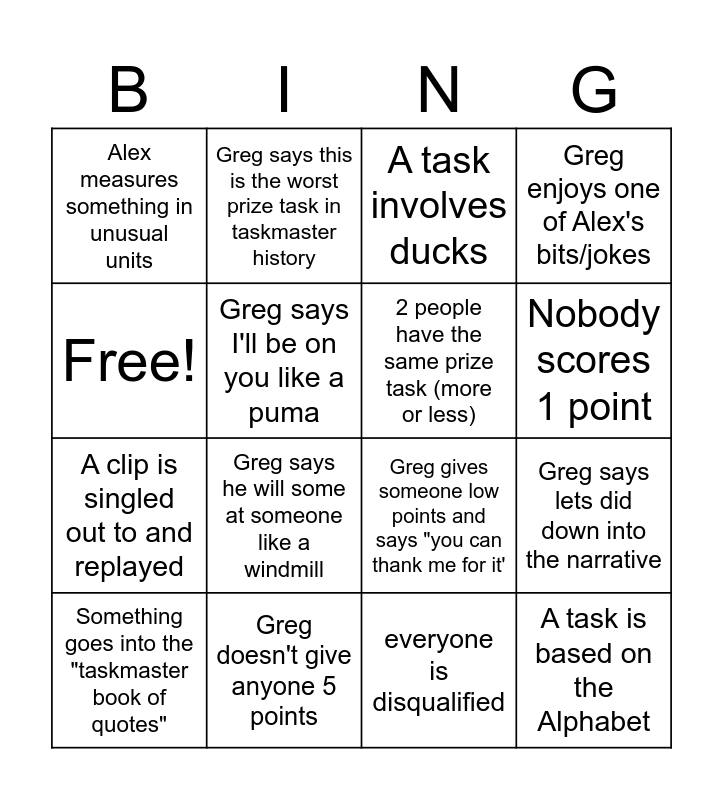 This bingo card has 16 words: Greg doesn't give anyone 5 points, Greg says lets did down into the narrative, A task involves ducks, Alex measures something in unusual units, A clip is singled out to and replayed, Greg says this is the worst prize task in taskmaster history, Greg gives someone low points and says "you can thank me for it', everyone is disqualified, Free!, Greg says I'll be on you like a puma, Something goes into the "taskmaster book of quotes", Greg enjoys one of Alex's bits/jokes, Greg says he will some at someone like a windmill, Nobody scores 1 point, 2 people have the same prize task (more or less) and A task is based on the Alphabet.