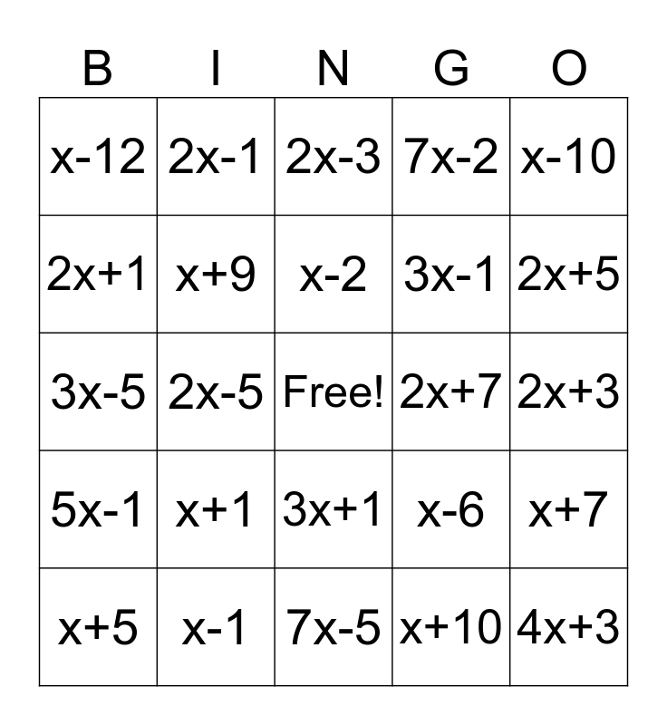 This bingo card has a free space and 24 words: x+1, x-1, x-2, x+5, x-10, x-12, 2x+1, 2x-1, 2x+7, 3x+1, 3x-1, 3x-5, x-6, x+7, x+9, x+10, 2x+3, 2x-3, 2x+5, 2x-5, 4x+3, 5x-1, 7x-2 and 7x-5.