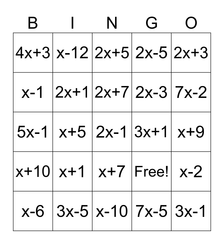 This bingo card has 25 words: x+1, x-10, 2x+7, x-6, 2x+3, 4x+3, x-1, x-12, 3x+1, x+7, 2x-3, 5x-1, Free!, x-2, 2x+1, 3x-1, x+9, 2x+5, 7x-2, x+5, 2x-1, 3x-5, x+10, 2x-5 and 7x-5.
