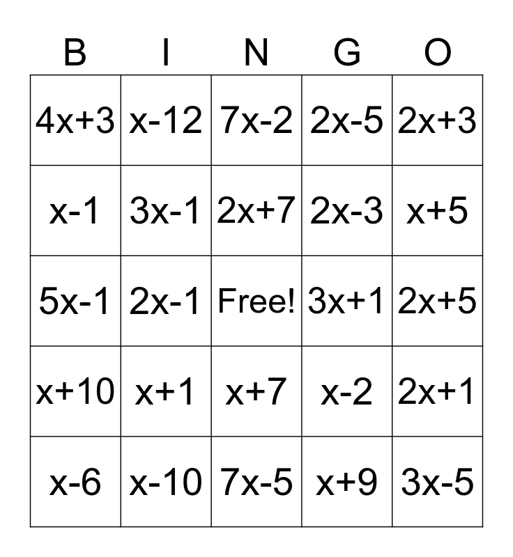 This bingo card has a free space and 24 words: x+1, x-10, 2x+7, x-6, 2x+3, 4x+3, x-1, x-12, 3x+1, x+7, 2x-3, 5x-1, x-2, 2x+1, 3x-1, x+9, 2x+5, 7x-2, x+5, 2x-1, 3x-5, x+10, 2x-5 and 7x-5.