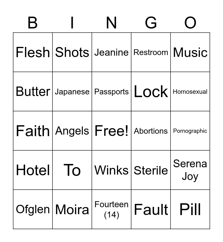 This bingo card has a free space and 29 words: Ofglen, Nick, Angels, Gilead, Flesh, Jeanine, Japanese, To, Abortions, Moira, Pornographic, Pill, Fourteen (14), Fault, Homosexual, Econowives, Winks, Hotel, Music, Faith, Sterile, Death, Lock, Butter, Restroom, Shots, Serena Joy, Passports and Picnic.
