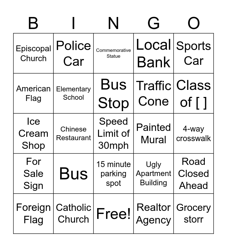 This bingo card has 25 words: For Sale Sign, Catholic Church, Speed Limit of 30mph, Realtor Agency, Sports Car, Episcopal Church, Police Car, Commemorative Statue, Painted Mural, Road Closed Ahead, American Flag, Elementary School, Free!, Ugly Apartment Building, Class of [ ], Foreign Flag, Chinese Restaurant, Bus Stop, Traffic Cone, 4-way crosswalk, Ice Cream Shop, Bus, 15 minute parking spot, Local Bank and Grocery storr.