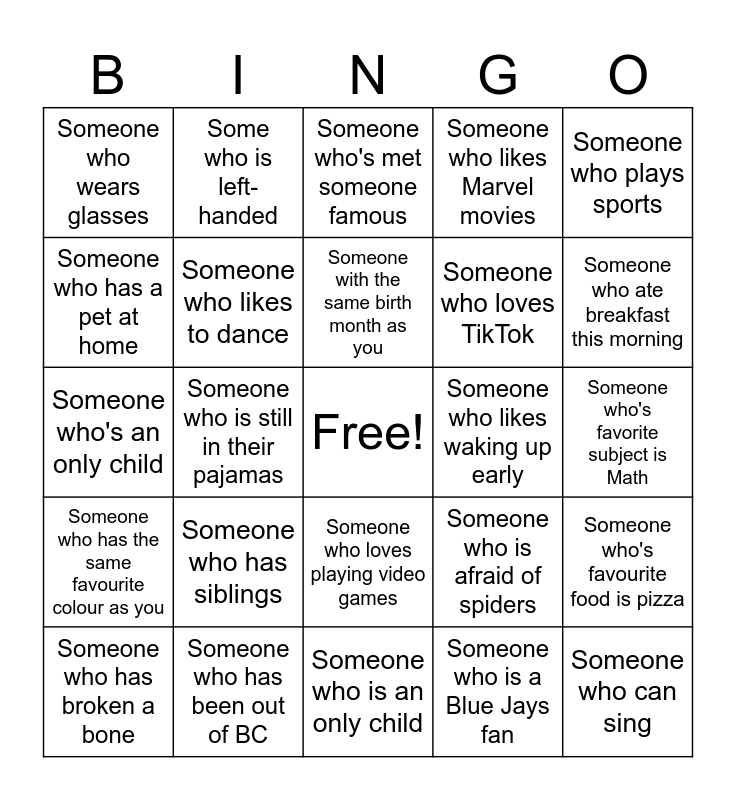 This bingo card has a free space and 24 words: Someone who has siblings, Someone who has been out of BC, Someone with the same birth month as you, Someone who has broken a bone, Someone who plays sports, Someone who wears glasses, Someone who has a pet at home, Some who is left-handed, Someone who likes waking up early, Someone who loves playing video games, Someone who loves TikTok, Someone who's an only child, Someone who is afraid of spiders, Someone who's favourite food is pizza, Someone who likes to dance, Someone who is a Blue Jays fan, Someone who's favorite subject is Math, Someone who's met someone famous, Someone who ate breakfast this morning, Someone who is still in their pajamas, Someone who can sing, Someone who has the same favourite colour as you, Someone who likes Marvel movies and Someone who is an only child.