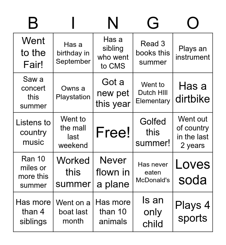This bingo card has a free space and 24 words: Worked this summer, Went on a boat last month, Got a new pet this year, Has more than 4 siblings, Plays an instrument, Went to the Fair!, Saw a concert this summer, Has a birthday in September, Golfed this summer!, Never flown in a plane, Went to Dutch HIll Elementary, Listens to country music, Has never eaten McDonald's, Loves soda, Owns a Playstation, Is an only child, Went out of country in the last 2 years, Has a sibling who went to CMS, Has a dirtbike, Went to the mall last weekend, Plays 4 sports, Ran 10 miles or more this summer, Read 3 books this summer and Has more than 10 animals.