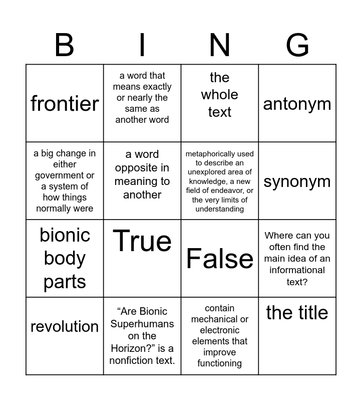This bingo card has 18 words: True, the title, the whole text, frontier, False, antonym, revolution, a word that means exactly or nearly the same as another word, synonym, bionic body parts, contain mechanical or electronic elements that improve functioning, a big change in either government or a system of how things normally were, Where can you often find the main idea of an informational text?, a word opposite in meaning to another, metaphorically used to describe an unexplored area of knowledge, a new field of endeavor, or the very limits of understanding, when a question asks about the “selection,” what is it referring to?, “Are Bionic Superhumans on the Horizon?” is a nonfiction text. and “Are Bionic Superhumans on the Horizon?” is an informational text..
