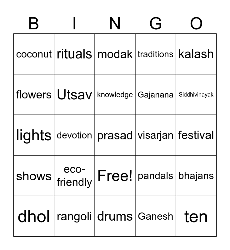 This bingo card has 26 words: Free!, Ganesh, knowledge, rangoli, kalash, coconut, flowers, rituals, festival, pandals, Gajanana, lights, bhajans, dhol, devotion, groups, traditions, shows, modak, prasad, Siddhivinayak, drums, visarjan, eco-friendly, Utsav and ten.