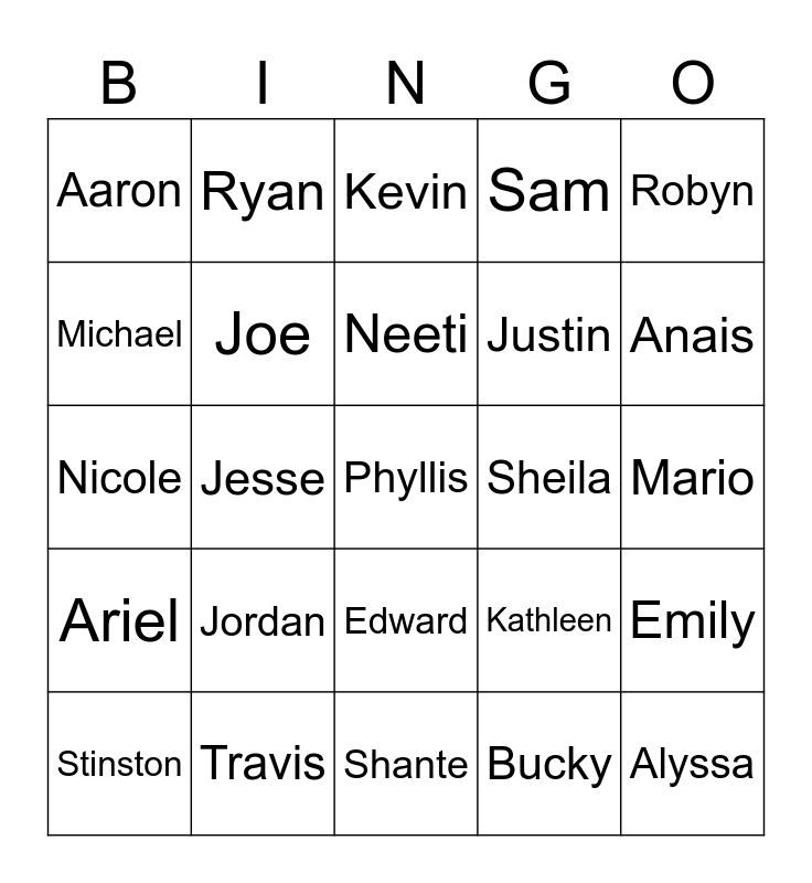This bingo card has a free space and 24 words: Jordan, Travis, Neeti, Stinston, Robyn, Aaron, Michael, Ryan, Sheila, Edward, Justin, Nicole, Kathleen, Emily, Joe, Bucky, Mario, Kevin, Anais, Jesse, Alyssa, Ariel, Sam and Shante.