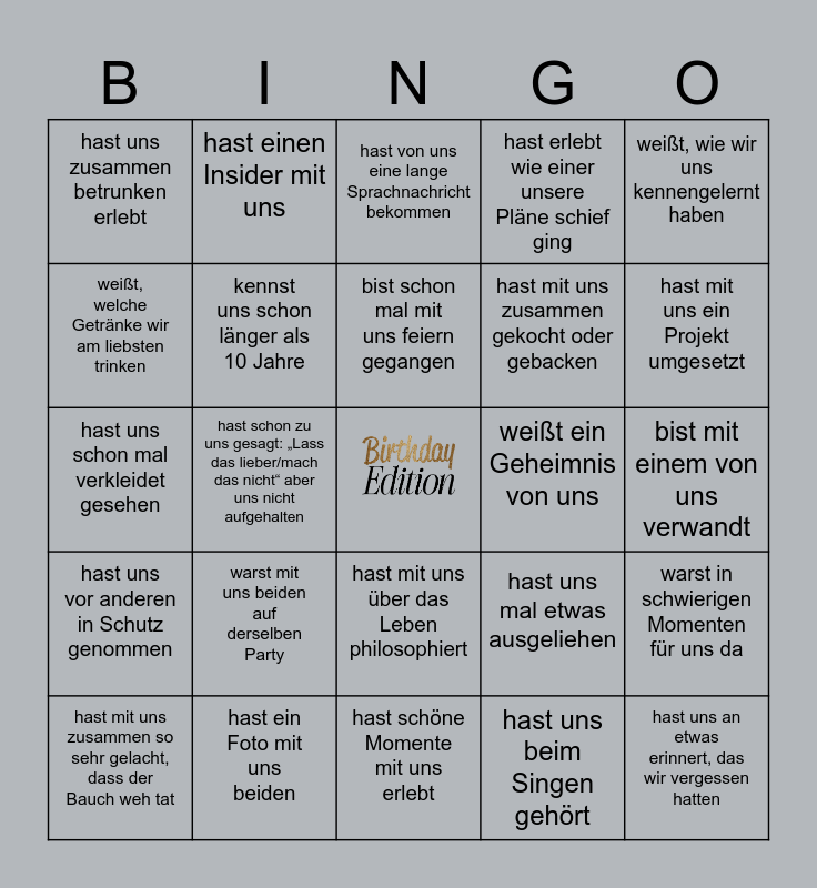 This bingo card has a free space and 24 words: warst mit uns beiden auf derselben Party, hast ein Foto mit uns beiden, bist schon mal mit uns feiern gegangen, hast mit uns zusammen so sehr gelacht, dass der Bauch weh tat, weißt, wie wir uns kennengelernt haben, hast uns zusammen betrunken erlebt, weißt, welche Getränke wir am liebsten trinken, hast einen Insider mit uns, weißt ein Geheimnis von uns, hast mit uns über das Leben philosophiert, hast mit uns zusammen gekocht oder gebacken, hast uns schon mal verkleidet gesehen, hast uns mal etwas ausgeliehen, warst in schwierigen Momenten für uns da, kennst uns schon länger als 10 Jahre, hast uns beim Singen gehört, bist mit einem von uns verwandt, hast von uns eine lange Sprachnachricht bekommen, hast mit uns ein Projekt umgesetzt, hast schon zu uns gesagt: „Lass das lieber/mach das nicht“ aber uns nicht aufgehalten, hast uns an etwas erinnert, das wir vergessen hatten, hast uns vor anderen in Schutz genommen, hast erlebt wie einer unsere Pläne schief ging and hast schöne Momente mit uns erlebt.