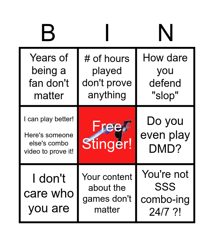 This bingo card has a free space and 10 words: Your content about the games don't matter, How dare you defend "slop", Years of being a fan don't matter, You're not SSS combo-ing 24/7 ?!, I can play better! Here's someone else's combo video to prove it!, I don't care who you are, # of hours played don't prove anything, You are *insert insult here*, Do you even play DMD? and You don't know what you're talking abou.