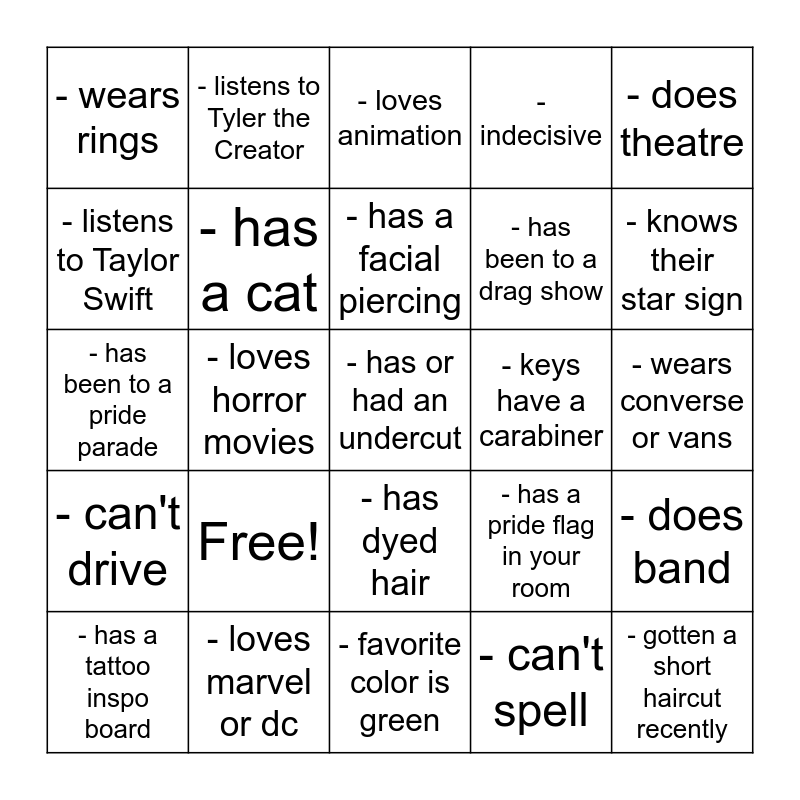 This bingo card has 25 words: Free!, - favorite color is green, - has a facial piercing, - has a tattoo inspo board, - does theatre, - wears rings, - listens to Taylor Swift, - listens to Tyler the Creator, - keys have a carabiner, - has dyed hair, - has been to a drag show, - has been to a pride parade, - has a pride flag in your room, - does band, - has a cat, - gotten a short haircut recently, - wears converse or vans, - loves animation, - knows their star sign, - loves horror movies, - has or had an undercut, - loves marvel or dc, - can't drive, - indecisive and - can't spell.