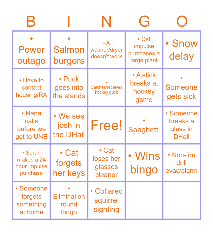 This bingo card has a free space and 24 words: • Nana calls before we get to UNE, • Elevator makes a funny sound, • Cat loses her glasses cleaner, • Someone forgets something at home, • Puck goes into the stands, • A washer/dryer doesn't work, • Cat impulse purchases a large plant, • Snow delay, • Power outage, • Cat forgets her keys, • A stick breaks at hockey game, • Someone gets sick, • Sarah makes a 24 hour impulse purchase, • Elimination round bingo, • Collared squirrel sighting, • Non-fire drill evac/alarm, • Have to contact housing/RA, • Salmon burgers, • Hockey player gets ejected from the game, • Spaghetti, • Someone breaks a glass in DHall, • We see josh in the DHall, • Catches/receives hockey puck and • Wins bingo.