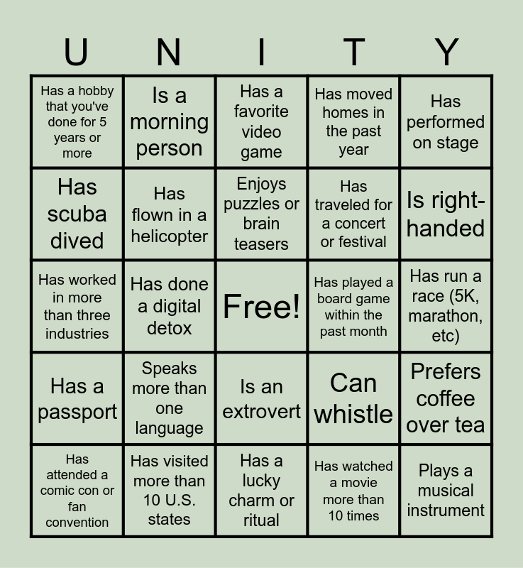 This bingo card has a free space and 62 words: Has traveled overseas, Has visited more than 10 U.S. states, Has lived in more than one country, Has a passport, Has traveled solo, Has visited a national park, Has flown in a helicopter, Has taken a cruise, Has traveled for a concert or festival, Has attended a wedding in the past year, Has moved homes in the past year, Has skydived, Has scuba dived, Has read more than 10 books this year, Knows how to juggle, Has a hobby that you've done for 5 years or more, Plays a musical instrument, Has performed on stage, Has binge-watched a whole series in one weekend, Enjoys puzzles or brain teasers, Has played a board game within the past month, Has a favorite video game, Has attended a comic con or fan convention, Has watched a movie more than 10 times, Has tried geocaching, Has taken a class just for fun (art, dance, cooking, etc), Loves spicy food, Prefers tea over coffee, Prefers coffee over tea, Has tried a dish you couldn't pronounce, Has baked bread from scratch, Has tried a food challenge (spicy, large portion, etc), Has made your own jam, pickles, sauce, (etc.), Practices yoga or meditation, Has run a race (5K, marathon, etc), Is a morning person, Is a night owl, Has a daily routine you love, Has done a digital detox, Has a degree in something unrelated to your job, Has worked in more than three industries, Has changed careers, Speaks more than one language, Is left-handed, Is right-handed, Can whistle, Has a hidden talent, Has met someone famous, Has been on TV or radio, Is an introvert, Is an extrovert, Has a lucky charm or ritual, Has a pet, Has gone camping, Loves hiking or nature walks, Has grown your own fruits or vegetables, Is a plant parent, Has done a DIY home project, Has celebrated a milestone birthday within the past year, Has been in a parade, Has volunteered for a cause and Enjoys thrifting.
