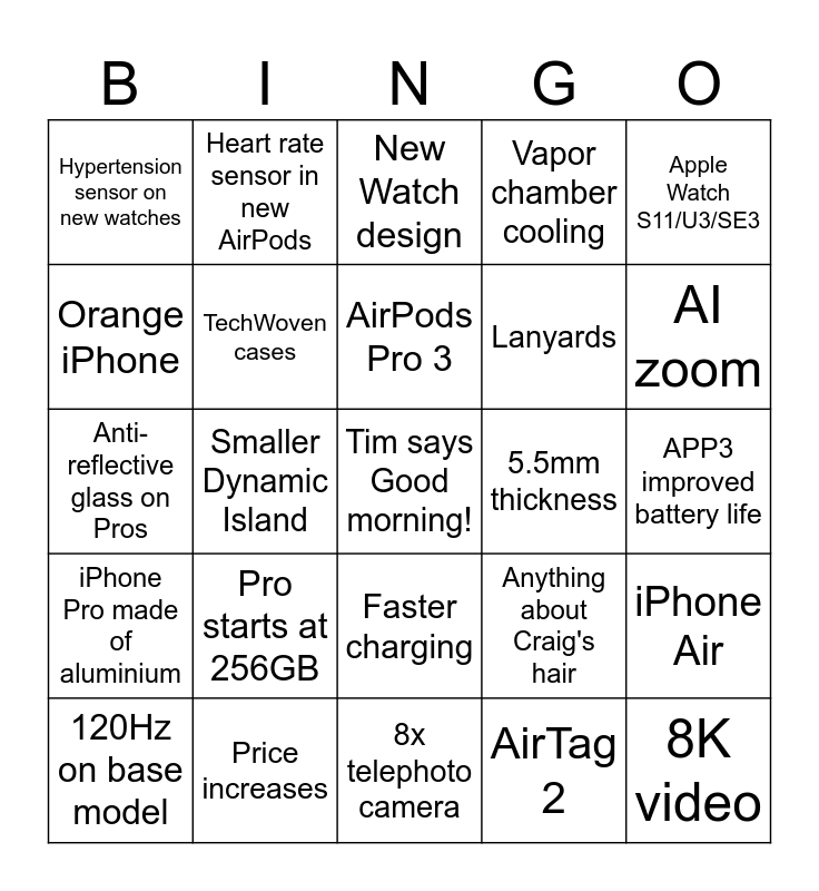 This bingo card has a free space and 24 words: 120Hz on base model, Pro starts at 256GB, AirPods Pro 3, AirTag 2, Apple Watch S11/U3/SE3, Hypertension sensor on new watches, Heart rate sensor in new AirPods, New Watch design, 5.5mm thickness, APP3 improved battery life, Anti-reflective glass on Pros, TechWoven cases, Anything about Craig's hair, iPhone Air, Orange iPhone, Price increases, 8x telephoto camera, Vapor chamber cooling, AI zoom, iPhone Pro made of aluminium, Smaller Dynamic Island, Faster charging, Lanyards and 8K video.
