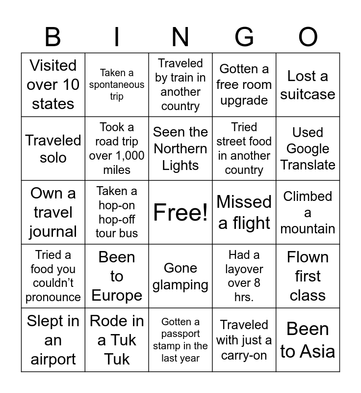 This bingo card has a free space and 25 words: Been to Europe, Gotten a passport stamp in the last year, Seen the Northern Lights, Slept in an airport, Lost a suitcase, Visited over 10 states, Traveled solo, Taken a spontaneous trip, Missed a flight, Gone glamping, Tried street food in another country, Own a travel journal, Had a layover over 8 hrs., Flown first class, Took a road trip over 1,000 miles, Visited a World Wonder, Climbed a mountain, Traveled by train in another country, Used Google Translate, Taken a hop-on hop-off tour bus, Been to Asia, Rode in a Tuk Tuk, Tried a food you couldn’t pronounce, Gotten a free room upgrade and Traveled with just a carry-on.