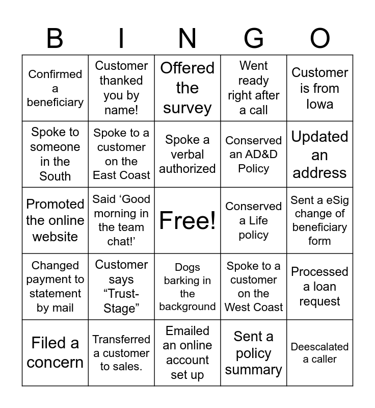 This bingo card has a free space and 24 words: Customer says “Trust-Stage”, Transferred a customer to sales., Spoke a verbal authorized, Filed a concern, Customer is from Iowa, Confirmed a beneficiary, Spoke to someone in the South, Customer thanked you by name!, Conserved a Life policy, Dogs barking in the background, Conserved an AD&D Policy, Promoted the online website, Spoke to a customer on the West Coast, Processed a loan request, Spoke to a customer on the East Coast, Sent a policy summary, Sent a eSig change of beneficiary form, Offered the survey, Updated an address, Said ‘Good morning in the team chat!’, Deescalated a caller, Changed payment to statement by mail, Went ready right after a call and Emailed an online account set up.
