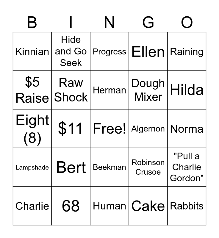 This bingo card has a free space and 29 words: Charlie, Bakery, $11, 32, Kinnian, Progress, Raw Shock, Bert, Algernon, 68, Norma, Rabbits, Human, Cake, Hilda, Machine, Beekman, Lampshade, Raining, Eight (8), Robinson Crusoe, Spelling, Dough Mixer, $5 Raise, Ellen, Hide and Go Seek, "Pull a Charlie Gordon", Herman and Lucille.
