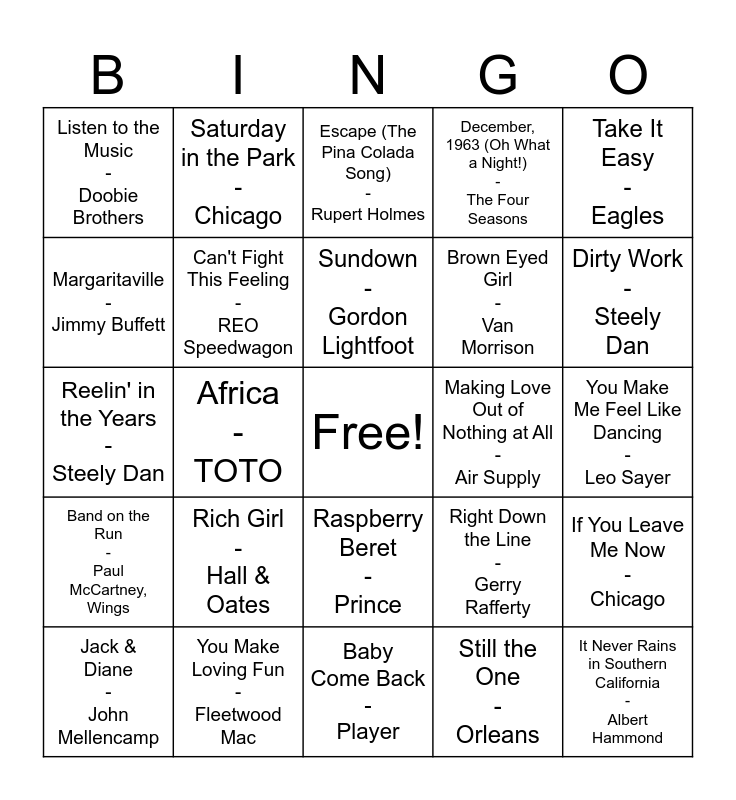 This bingo card has a free space and 31 words: Baby Come Back - Player, She's Gone - Hall & Oates, Africa - TOTO, Do It Again - Steely Dan, Listen to the Music - Doobie Brothers, Escape (The Pina Colada Song) - Rupert Holmes, Can't Fight This Feeling - REO Speedwagon, Right Down the Line - Gerry Rafferty, Making Love Out of Nothing at All - Air Supply, Still the One - Orleans, You Make Me Feel Like Dancing - Leo Sayer, It Never Rains in Southern California - Albert Hammond, One of These Nights - Eagles, Bennie and the Jets - Elton John, Dirty Work - Steely Dan, You're So Vain - Carly Simon, If You Leave Me Now - Chicago, Rich Girl - Hall & Oates, Band on the Run - Paul McCartney, Wings, Raspberry Beret - Prince, Take It Easy - Eagles, Hold the Line - TOTO, Jack & Diane - John Mellencamp, Saturday in the Park - Chicago, Brown Eyed Girl - Van Morrison, Margaritaville - Jimmy Buffett, December, 1963 (Oh What a Night!) - The Four Seasons, Reelin' in the Years - Steely Dan, You Make Loving Fun - Fleetwood Mac, Sundown - Gordon Lightfoot and Keep on Loving You - REO Speedwagon.