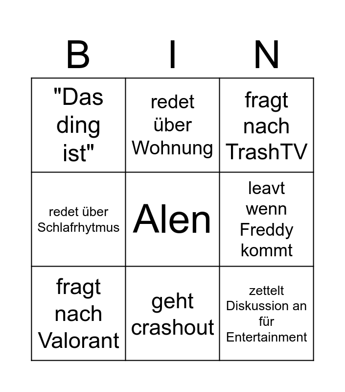 This bingo card has 9 words: fragt nach Valorant, fragt nach TrashTV, redet über Wohnung, redet über Schlafrhytmus, "Das ding ist", leavt wenn Freddy kommt, Alen, zettelt Diskussion an für Entertainment and geht crashout.