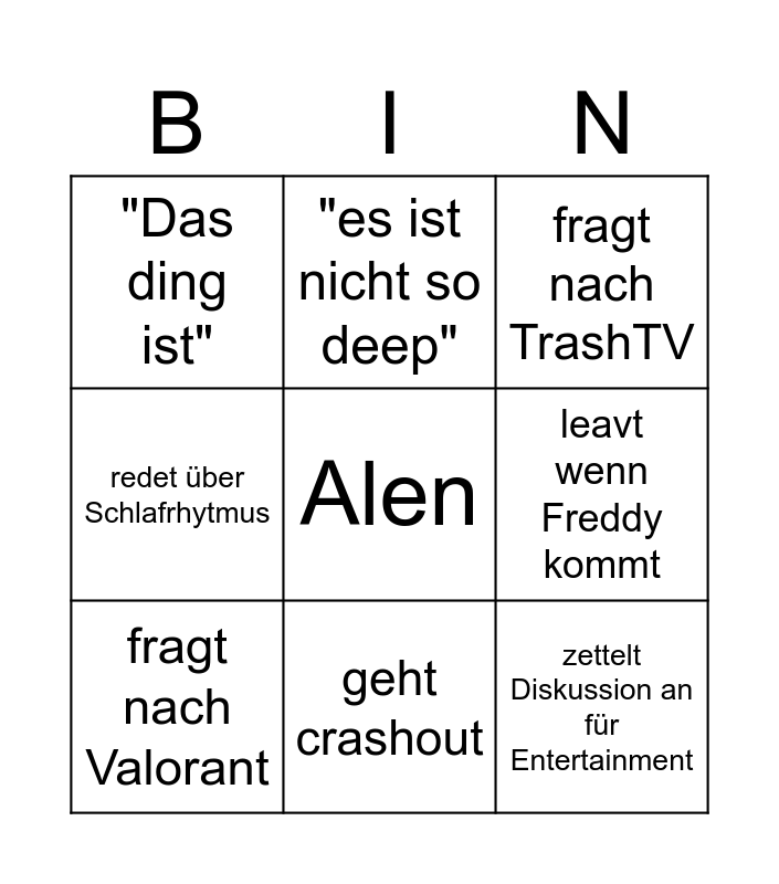 This bingo card has 9 words: fragt nach Valorant, fragt nach TrashTV, "es ist nicht so deep", redet über Schlafrhytmus, "Das ding ist", leavt wenn Freddy kommt, Alen, zettelt Diskussion an für Entertainment and geht crashout.
