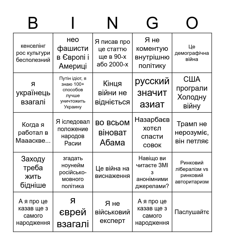 This bingo card has a free space and 24 words: згадать ноунейм російсько- мовного політика, я єврей взагалі, Кінця війни не відніється, А я про це казав ще з самого народження, Це демографічна війна, кенселінг рос культури бесполезний, я українець взагалі, нео фашисти в Європі і Америці, Назарбаєв хотєл спасти совок, Це війна на виснаження, русский значит азиат, Когда я работал в Маааскве..., Навіщо ви читаєте ЗМІ з анонімними джерелами?, Ринковий лібералізм vs ринковий авторитаризм, Путін ідіот, я знаю 100+ способов лучше уничтожить Украину, А я про це казав ще з самого народження, Трамп не нерозуміє, він петляє, Я писав про це статтю ще в 90-х або 2000-х, США програли Холодну війну, Я іследовал положение народов Расии, Паслушайтє, Заходу треба жить бідніше, Я не коментую внутрішню політику and Я не військовий експерт.