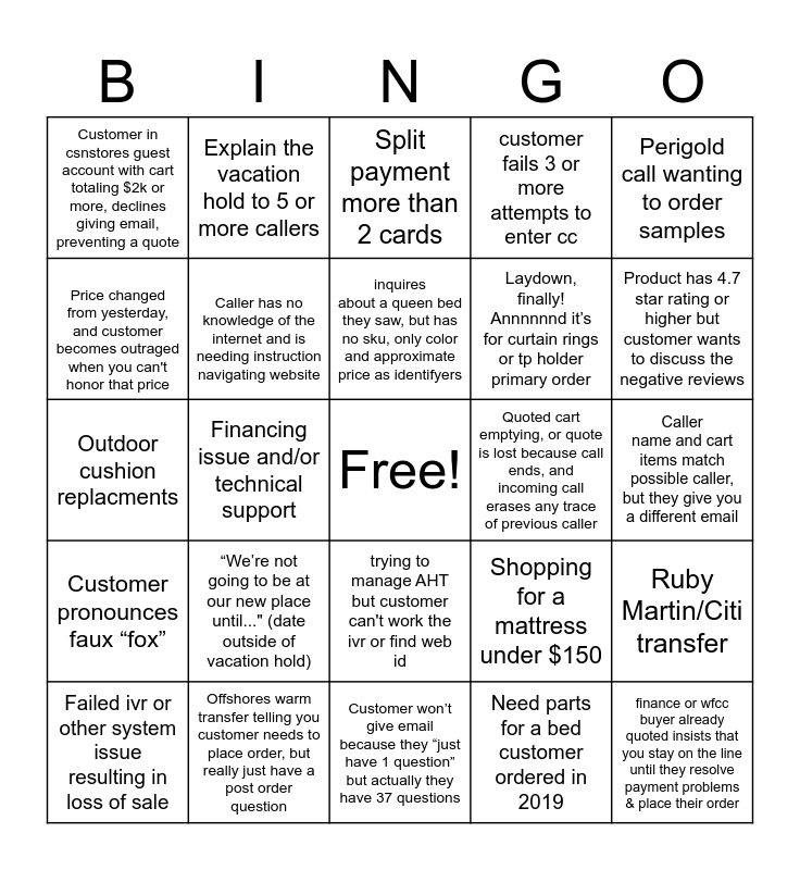 This bingo card has a free space and 24 words: “We’re not going to be at our new place until..." (date outside of vacation hold), Offshores warm transfer telling you customer needs to place order, but really just have a post order question, inquires about a queen bed they saw, but has no sku, only color and approximate price as identifyers, Failed ivr or other system issue resulting in loss of sale, Perigold call wanting to order samples, Customer in csnstores guest account with cart totaling $2k or more, declines giving email, preventing a quote, Price changed from yesterday, and customer becomes outraged when you can't honor that price, Explain the vacation hold to 5 or more callers, Quoted cart emptying, or quote is lost because call ends, and incoming call erases any trace of previous caller, trying to manage AHT but customer can't work the ivr or find web id, Laydown, finally! Annnnnnd it’s for curtain rings or tp holder primary order, Outdoor cushion replacments, Shopping for a mattress under $150, Ruby Martin/Citi transfer, Caller has no knowledge of the internet and is needing instruction navigating website, Need parts for a bed customer ordered in 2019, Caller name and cart items match possible caller, but they give you a different email, Split payment more than 2 cards, Product has 4.7 star rating or higher but customer wants to discuss the negative reviews, Financing issue and/or technical support, finance or wfcc buyer already quoted insists that you stay on the line until they resolve payment problems & place their order, Customer pronounces faux “fox”, customer fails 3 or more attempts to enter cc and Customer won’t give email because they “just have 1 question” but actually they have 37 questions.