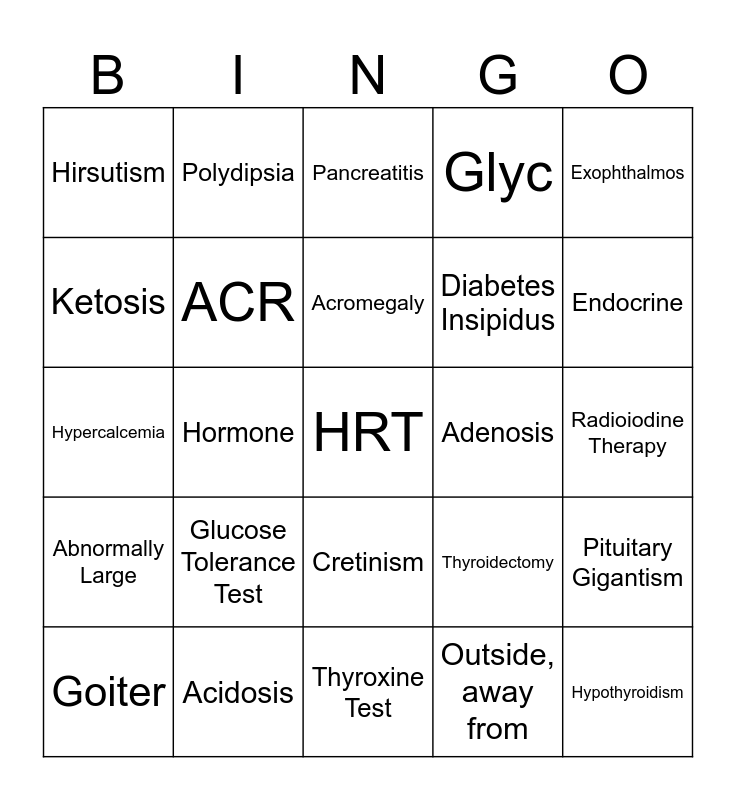 This bingo card has a free space and 24 words: Glucose Tolerance Test, Acidosis, Acromegaly, Goiter, Exophthalmos, Hirsutism, Ketosis, Polydipsia, Adenosis, Cretinism, Diabetes Insipidus, Hypercalcemia, Thyroidectomy, Pituitary Gigantism, ACR, Outside, away from, Radioiodine Therapy, Pancreatitis, Endocrine, Hormone, Hypothyroidism, Abnormally Large, Glyc and Thyroxine Test.