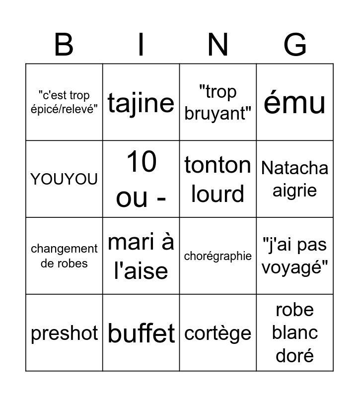 This bingo card has 16 words: buffet, "j'ai pas voyagé", "trop bruyant", "c'est trop épicé/relevé", changement de robes, tajine, chorégraphie, cortège, YOUYOU, 10 ou -, preshot, ému, mari à l'aise, Natacha aigrie, tonton lourd and robe blanc doré.