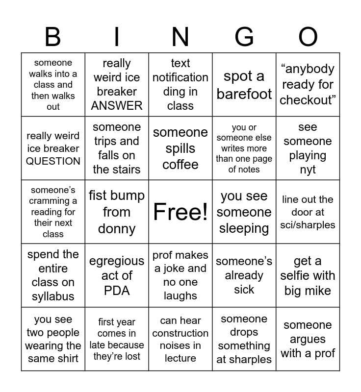 This bingo card has a free space and 24 words: egregious act of PDA, first year comes in late because they’re lost, someone spills coffee, you see two people wearing the same shirt, “anybody ready for checkout”, someone walks into a class and then walks out, really weird ice breaker QUESTION, really weird ice breaker ANSWER, you see someone sleeping, prof makes a joke and no one laughs, you or someone else writes more than one page of notes, someone’s cramming a reading for their next class, someone’s already sick, get a selfie with big mike, someone trips and falls on the stairs, someone drops something at sharples, line out the door at sci/sharples, text notification ding in class, see someone playing nyt, fist bump from donny, someone argues with a prof, spend the entire class on syllabus, spot a barefoot and can hear construction noises in lecture.