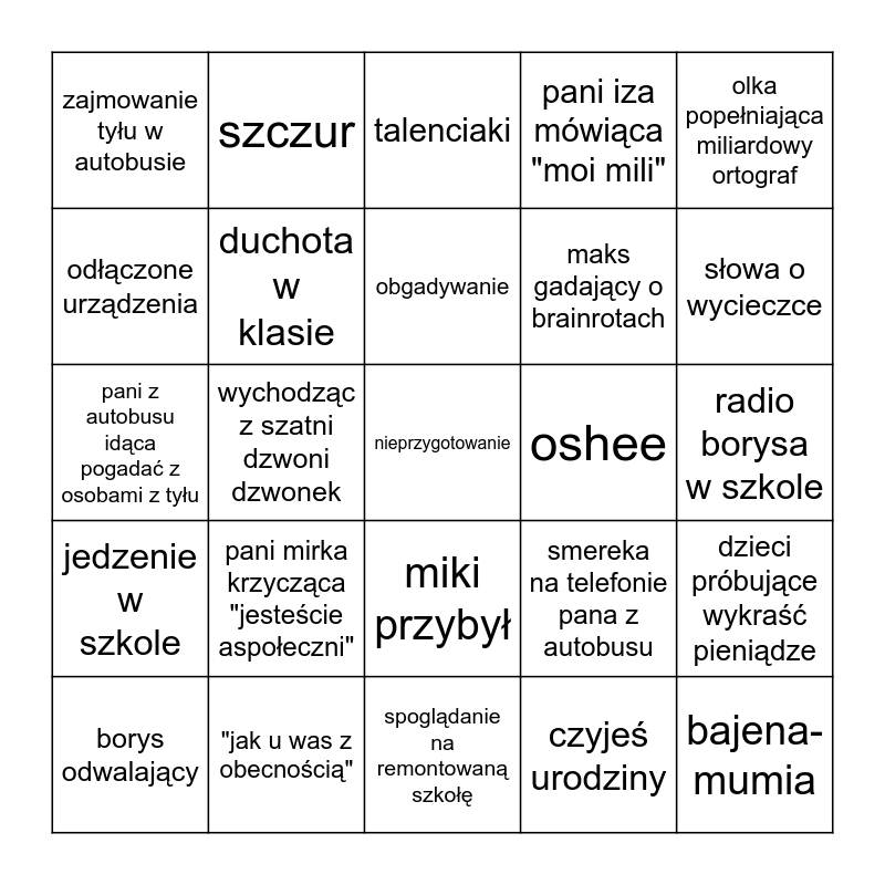 This bingo card has a free space and 24 words: pani mirka krzycząca "jesteście aspołeczni", "jak u was z obecnością", obgadywanie, borys odwalający, olka popełniająca miliardowy ortograf, zajmowanie tyłu w autobusie, odłączone urządzenia, szczur, oshee, miki przybył, maks gadający o brainrotach, pani z autobusu idąca pogadać z osobami z tyłu, smereka na telefonie pana z autobusu, dzieci próbujące wykraść pieniądze, duchota w klasie, czyjeś urodziny, radio borysa w szkole, talenciaki, słowa o wycieczce, wychodząc z szatni dzwoni dzwonek, bajena-mumia, jedzenie w szkole, pani iza mówiąca "moi mili" and spoglądanie na remontowaną szkołę.