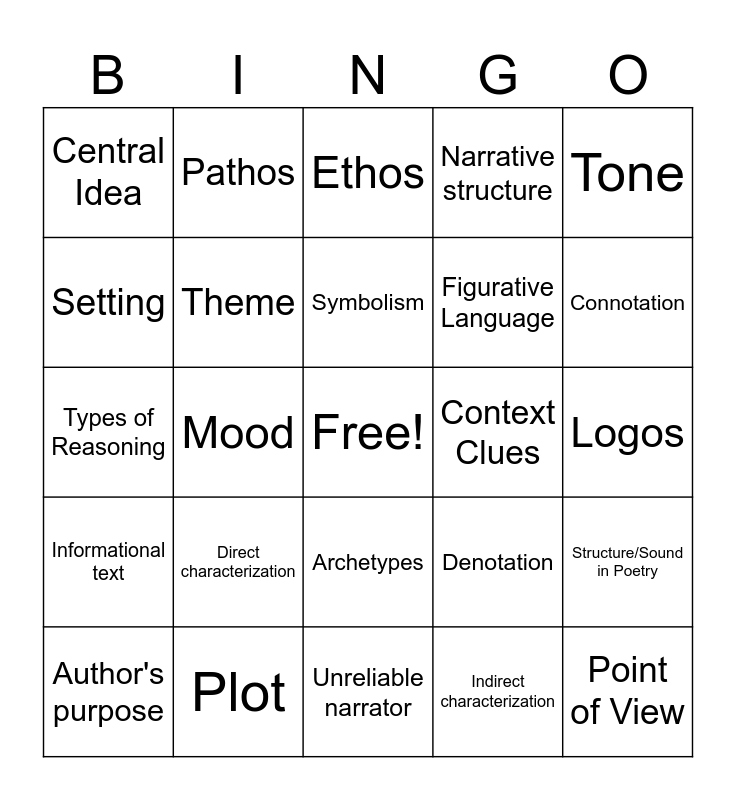 This bingo card has a free space and 24 words: Direct characterization, Plot, Symbolism, Author's purpose, Tone, Central Idea, Setting, Pathos, Context Clues, Archetypes, Figurative Language, Types of Reasoning, Denotation, Structure/Sound in Poetry, Theme, Indirect characterization, Logos, Ethos, Connotation, Mood, Point of View, Informational text, Narrative structure and Unreliable narrator.