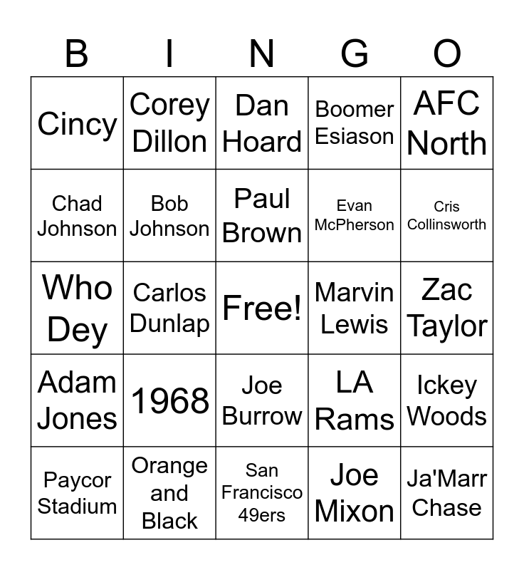 This bingo card has a free space and 24 words: 1968, Orange and Black, Paul Brown, Paycor Stadium, AFC North, Cincy, Chad Johnson, Corey Dillon, Marvin Lewis, Joe Burrow, Evan McPherson, Who Dey, LA Rams, Ickey Woods, Bob Johnson, Joe Mixon, Zac Taylor, Dan Hoard, Cris Collinsworth, Carlos Dunlap, Ja'Marr Chase, Adam Jones, Boomer Esiason and San Francisco 49ers.