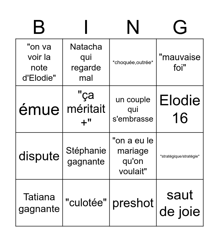 This bingo card has 16 words: "culotée", "stratégique/stratégie", *choquée,outrée*, "on va voir la note d'Elodie", dispute, Natacha qui regarde mal, "on a eu le mariage qu'on voulait", preshot, émue, "ça méritait +", Tatiana gagnante, "mauvaise foi", Stéphanie gagnante, Elodie 16, un couple qui s'embrasse and saut de joie.