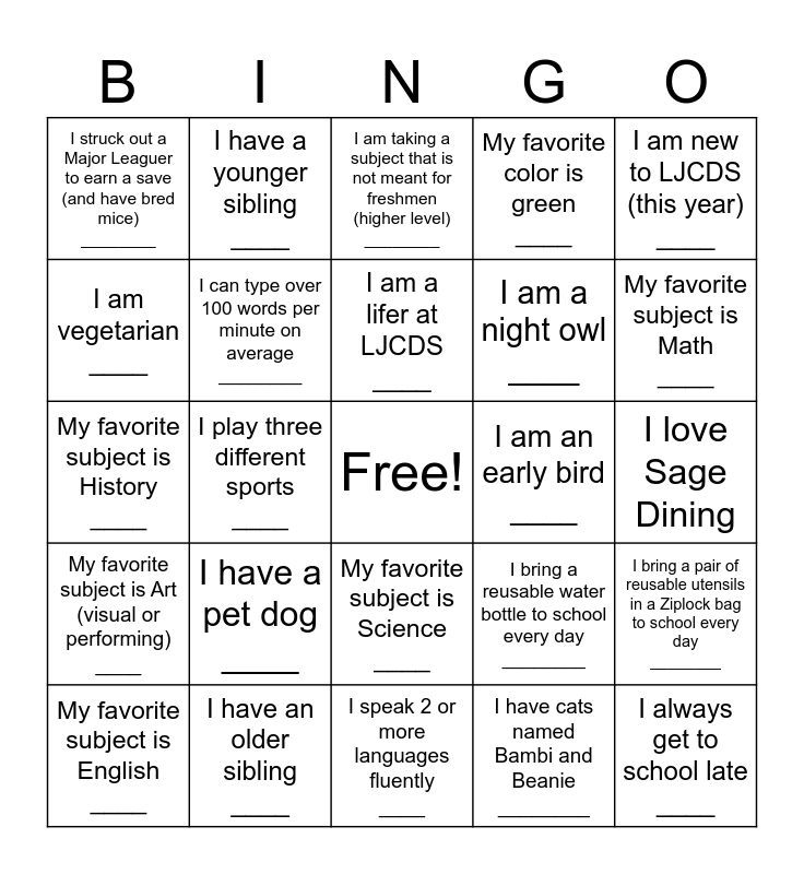 This bingo card has a free space and 24 words: I have a pet dog ____, I have an older sibling ____, I am a lifer at LJCDS ____, My favorite subject is English ____, I am new to LJCDS (this year) ____, I struck out a Major Leaguer to earn a save (and have bred mice) ________, I am vegetarian ____, I have a younger sibling ____, I am an early bird ____, My favorite subject is Science ____, I am a night owl ____, My favorite subject is History ____, I bring a reusable water bottle to school every day ________, I bring a pair of reusable utensils in a Ziplock bag to school every day ________, I can type over 100 words per minute on average ________, I have cats named Bambi and Beanie ________, I love Sage Dining, I am taking a subject that is not meant for freshmen (higher level) ________, My favorite subject is Math ____, I play three different sports ____, I always get to school late ____, My favorite subject is Art (visual or performing) ____, My favorite color is green ____ and I speak 2 or more languages fluently ____.