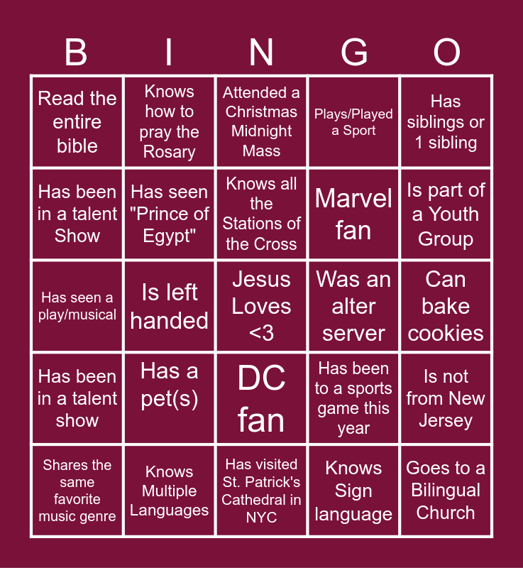 This bingo card has a free space and 24 words: Has a pet(s), Knows Multiple Languages, Knows all the Stations of the Cross, Shares the same favorite music genre, Has siblings or 1 sibling, Read the entire bible, Has been in a talent Show, Knows how to pray the Rosary, Was an alter server, DC fan, Marvel fan, Has seen a play/musical, Has been to a sports game this year, Is not from New Jersey, Has seen "Prince of Egypt", Knows Sign language, Can bake cookies, Attended a Christmas Midnight Mass, Is part of a Youth Group, Is left handed, Goes to a Bilingual Church, Has been in a talent show, Plays/Played a Sport and Has visited St. Patrick's Cathedral in NYC.
