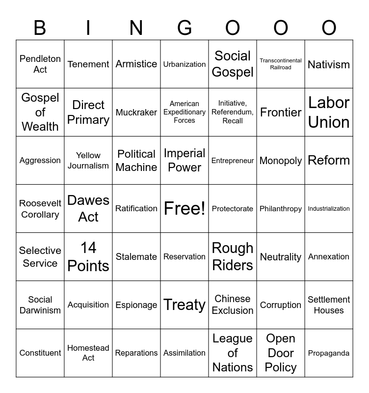 This bingo card has a free space and 48 words: Chinese Exclusion, Frontier, Assimilation, Dawes Act, Political Machine, Industrialization, Tenement, Homestead Act, Transcontinental Railroad, Reservation, Nativism, Urbanization, Monopoly, Entrepreneur, Social Darwinism, Philanthropy, Gospel of Wealth, Labor Union, Corruption, Social Gospel, Initiative, Referendum, Recall, Ratification, Pendleton Act, Direct Primary, Settlement Houses, Muckraker, Reform, Constituent, Imperial Power, Yellow Journalism, Open Door Policy, Protectorate, Annexation, Acquisition, Roosevelt Corollary, Rough Riders, Neutrality, Aggression, Stalemate, Espionage, Selective Service, Propaganda, Armistice, Reparations, American Expeditionary Forces, Treaty, 14 Points and League of Nations.