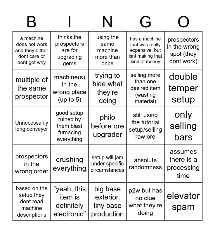This bingo card has 25 words: crushing everything, big base exterior, tiny base production, trying to hide what they're doing, based on the setup they dont read machine descriptions, prospectors in the wrong spot (they dont work), a machine does not work and they either dont care or dont get why, multiple of the same prospector, thinks the prospectors are for upgrading gems, still using the tutorial setup/selling raw ore, setup will jam under specific circumstances, selling more than one desired item (wasting material), Unnecessarily long conveyor, absolute randomness, assumes there is a processing time, machine(s) in the wrong place (up to 5), elevator spam, only selling bars, using the same machine more than once, double temper setup, good setup ruined by them blast furnacing everything, philo before ore upgrader, "yeah, this item is definitely electronic", prospectors in the wrong order, has a machine that was really expensive, but isnt making that kind of money and p2w but has no clue what they're doing.