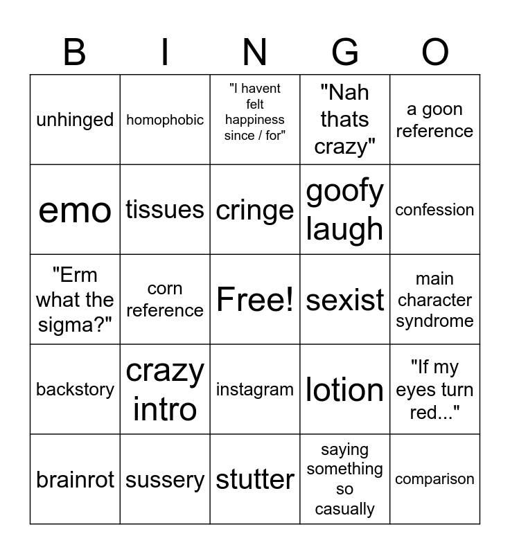 This bingo card has a free space and 24 words: crazy intro, sussery, cringe, brainrot, a goon reference, unhinged, emo, homophobic, sexist, instagram, goofy laugh, "Erm what the sigma?", lotion, "If my eyes turn red...", tissues, saying something so casually, main character syndrome, "I havent felt happiness since / for", confession, corn reference, comparison, backstory, "Nah thats crazy" and stutter.