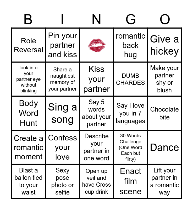 This bingo card has 1 images, a free space and 23 words: Confess your love, Sexy pose photo or selfie, Kiss your partner, Blast a ballon tied to your waist, Give a hickey, Role Reversal, look into your partner eye without blinking, Pin your partner and kiss, Say I love you in 7 languages, Describe your partner in one word, DUMB CHARDES, Body Word Hunt, 30 Words Challenge (One Word Each but flirty), Dance, Share a naughtiest memory of your partner, Enact film scene, Chocolate bite, Make your partner shy or blush, Sing a song, Lift your partner in a romantic way, Create a romantic moment, romantic back hug and Open up veil and have Cross cup drink.