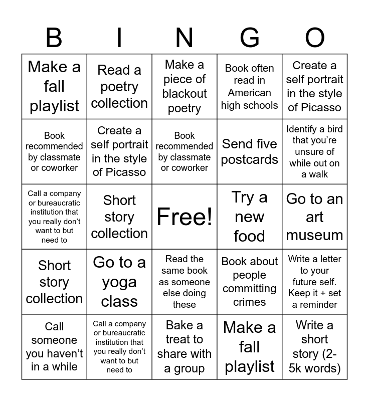 This bingo card has a free space and 42 words: Read a poetry collection, Book recommended by classmate or coworker, Book published pre-1950, Go to a yoga class, Make a fall playlist, Write a letter to your future self. Keep it + set a reminder, Write a short story (2-5k words), Send five postcards, Make a piece of blackout poetry, Read the same book as someone else doing these, Go to an art museum, Identify a bird that you’re unsure of while out on a walk, Short story collection, Create a self portrait in the style of Picasso, Bake a treat to share with a group, Book about people committing crimes, Call someone you haven’t in a while, Call a company or bureaucratic institution that you really don’t want to but need to, Try a new food, Read a poetry collection, Book recommended by classmate or coworker, Book published pre-1950, Go to a yoga class, Make a fall playlist, Write a letter to your future self. Keep it + set a reminder, Write a short story (2-5k words), Send five postcards, Make a piece of blackout poetry, Read the same book as someone else doing these, Go to an art museum, Identify a bird that you’re unsure of while out on a walk, Short story collection, Create a self portrait in the style of Picasso, Bake a treat to share with a group, Book about people committing crimes, Call someone you haven’t in a while, Call a company or bureaucratic institution that you really don’t want to but need to, Try a new food, Go on a picnic, Write a limerick, Book often read in American high schools and Try an episode of two new podcasts.