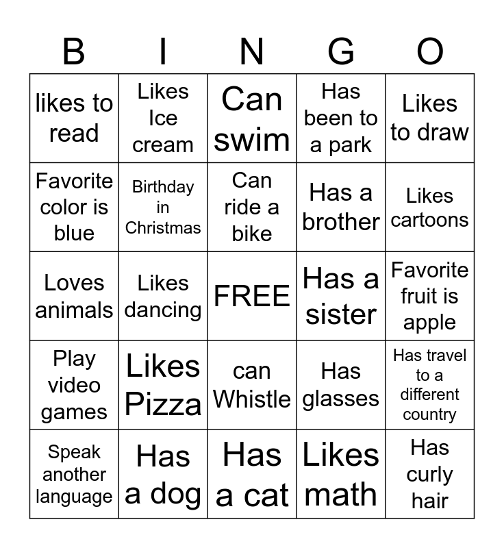 This bingo card has a free space and 24 words: Likes Pizza, Has a dog, Can ride a bike, Speak another language, Likes to draw, likes to read, Favorite color is blue, Likes Ice cream, Has a sister, can Whistle, Has a brother, Loves animals, Has glasses, Has travel to a different country, Birthday in Christmas, Likes math, Favorite fruit is apple, Can swim, Likes cartoons, Likes dancing, Has curly hair, Play video games, Has been to a park and Has a cat.