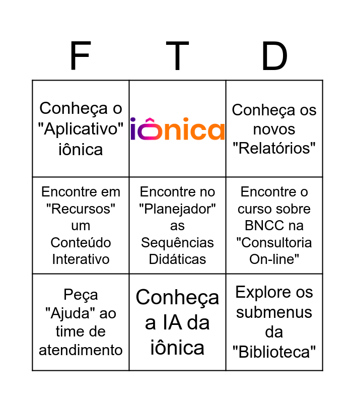 This bingo card has 1 images and 10 words: Explore os submenus da "Biblioteca", Conheça a IA da iônica, Encontre no "Planejador" as Sequências Didáticas, Peça "Ajuda" ao time de atendimento, Conheça os novos "Relatórios", Encontre o curso sobre BNCC na "Consultoria On-line", "Favorite" um livro, Encontre em "Recursos" um Conteúdo Interativo, Conheça o "Aplicativo" iônica and Acesse o "Guia para Inclusão".