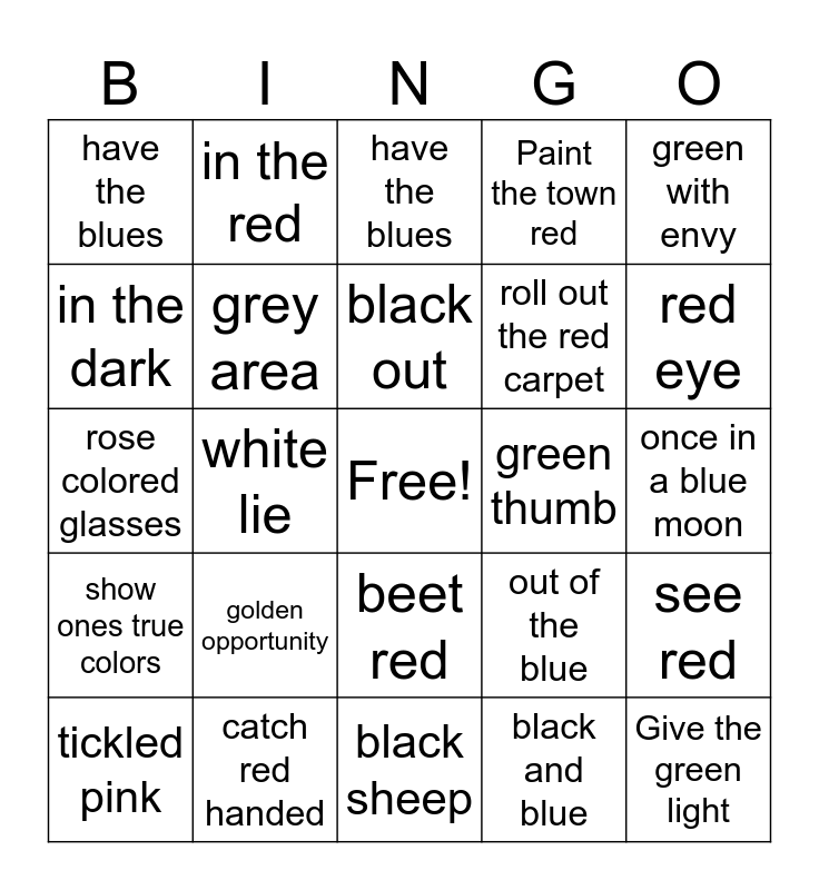This bingo card has a free space and 26 words: beet red, black and blue, black out, catch red handed, green with envy, have the blues, in the dark, in the red, once in a blue moon, out of the blue, roll out the red carpet, rose colored glasses, see red, tickled pink, white lie, with flying colours, Paint the town red, show ones true colors, have the blues, Give the green light, red eye, black sheep, green thumb, golden opportunity, grey area and born with a silver spoon in your mouth.
