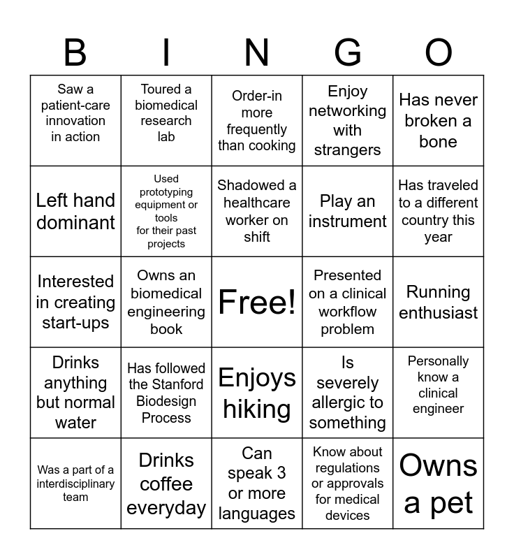 This bingo card has a free space and 24 words: Has followed the Stanford Biodesign Process, Drinks coffee everyday, Shadowed a healthcare worker on shift, Was a part of a interdisciplinary team, Has never broken a bone, Saw a patient-care innovation in action, Left hand dominant, Toured a biomedical research lab, Presented on a clinical workflow problem, Enjoys hiking, Play an instrument, Interested in creating start-ups, Is severely allergic to something, Personally know a clinical engineer, Used prototyping equipment or tools for their past projects, Know about regulations or approvals for medical devices, Running enthusiast, Order-in more frequently than cooking, Has traveled to a different country this year, Owns an biomedical engineering book, Owns a pet, Drinks anything but normal water, Enjoy networking with strangers and Can speak 3 or more languages.