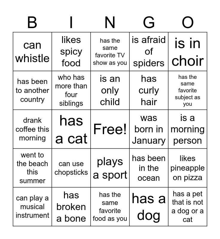 This bingo card has a free space and 27 words: has been in the ocean, was born in March, has curly hair, has the same favorite food as you, has been to another country, has the same favorite TV show as you, likes spicy food, went to the beach this summer, was born in January, likes pineapple on pizza, drank coffee this morning, is afraid of spiders, can play a musical instrument, has broken a bone, has the same favorite subject as you, has an odd-numbered birthday, who has more than four siblings, is an only child, can use chopsticks, can whistle, is a morning person, has a dog, has a cat, has a pet that is not a dog or a cat, plays a sport, is in choir and went camping this summer.
