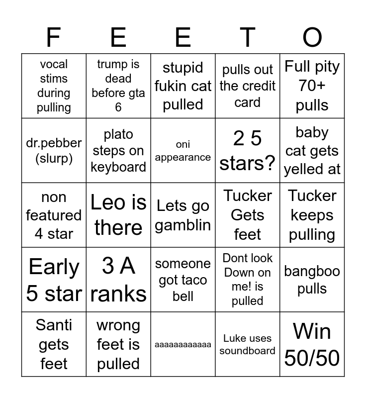 This bingo card has a free space and 29 words: Santi gets feet, Weapon pull, Leo is there, alice still hasnt eaten her food, vocal stims during pulling, stupid fukin cat pulled, plato steps on keyboard, 3 A ranks, Tucker Gets feet, wrong feet is pulled, Tucker keeps pulling, Win 50/50, aaaaaaaaaaaa, Luke uses soundboard, baby cat gets yelled at, Ivan pulls, someone got taco bell, Early 5 star, Full pity 70+ pulls, non featured 4 star, Dont look Down on me! is pulled, Lose 50/50, 2 5 stars?, dr.pebber (slurp), pulls out the credit card, trump is dead before gta 6, bangboo pulls, oni appearance and somebody redownloads the game.
