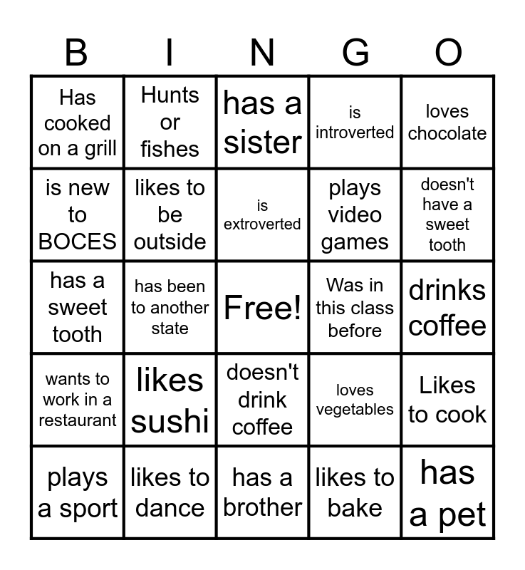 This bingo card has a free space and 24 words: likes sushi, likes to dance, is extroverted, plays a sport, loves chocolate, Has cooked on a grill, is new to BOCES, Hunts or fishes, Was in this class before, doesn't drink coffee, plays video games, has a sweet tooth, loves vegetables, Likes to cook, likes to be outside, likes to bake, drinks coffee, has a sister, doesn't have a sweet tooth, has been to another state, has a pet, wants to work in a restaurant, is introverted and has a brother.