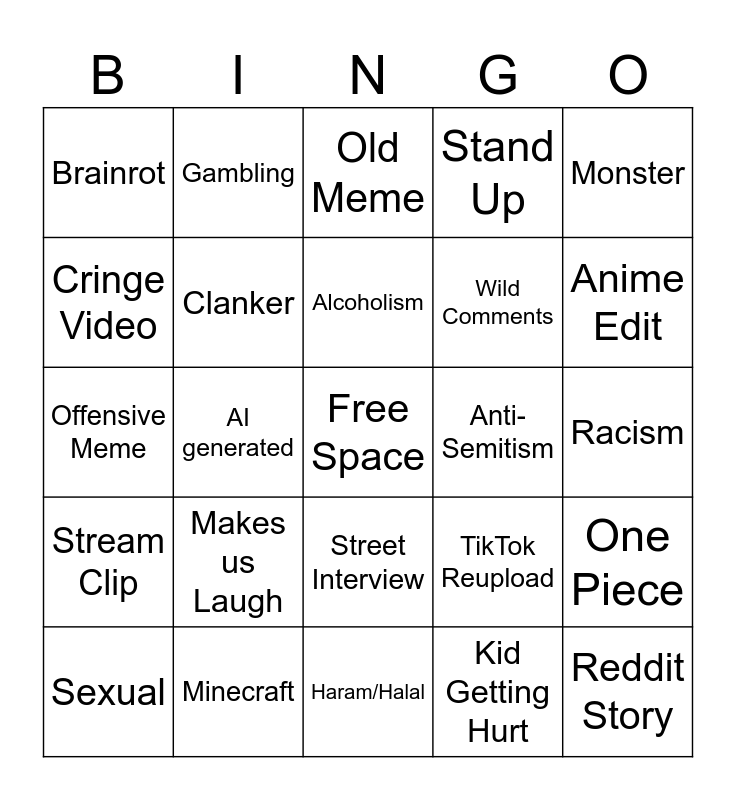 This bingo card has a free space and 24 words: Makes us Laugh, Minecraft, Alcoholism, Sexual, Monster, Brainrot, Cringe Video, Gambling, Anti-Semitism, Street Interview, Wild Comments, Offensive Meme, TikTok Reupload, One Piece, Clanker, Kid Getting Hurt, Racism, Old Meme, Anime Edit, AI generated, Reddit Story, Stream Clip, Stand Up and Haram/Halal.